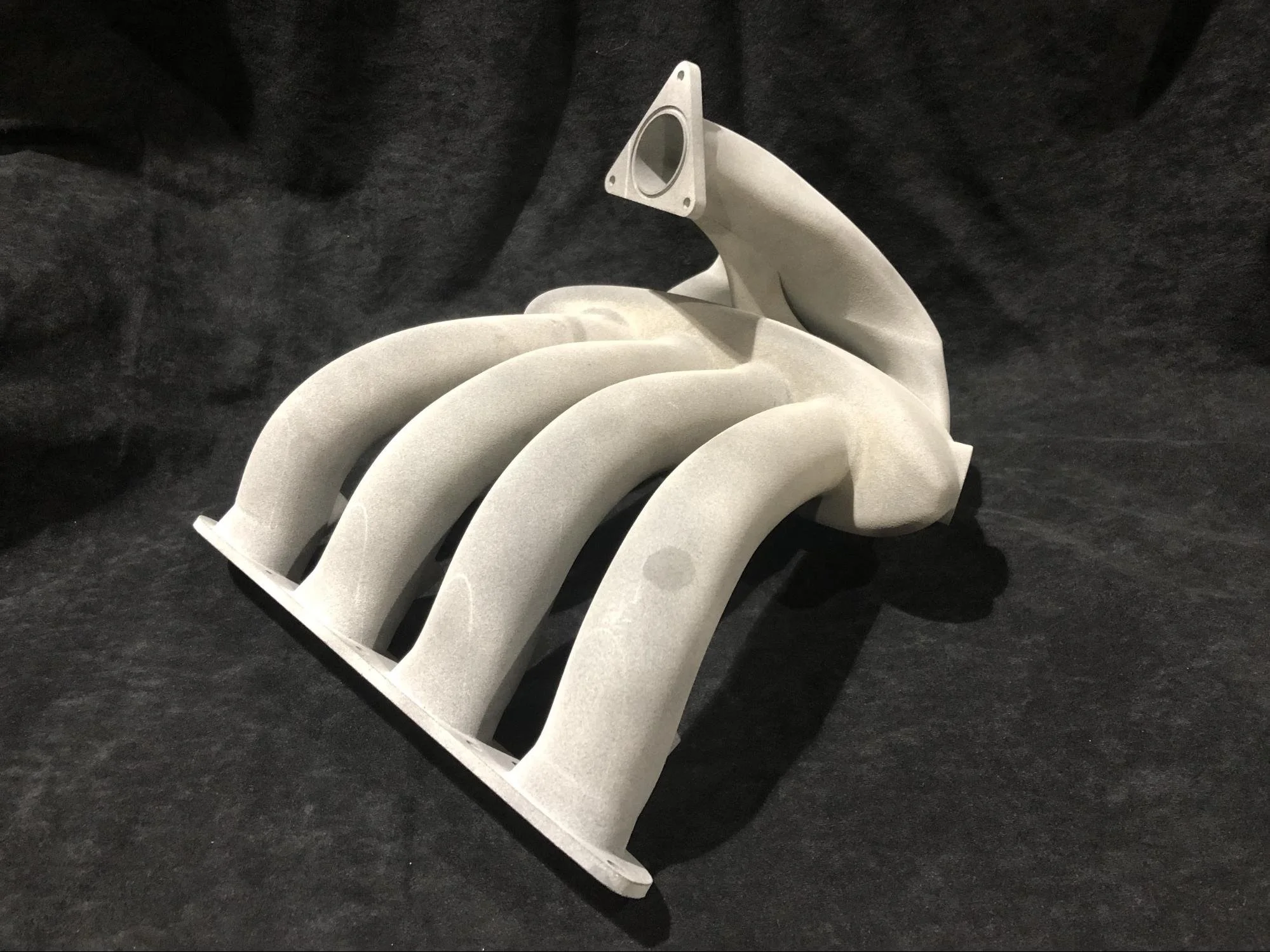 Intake manifold fresh from the 3D printing shop who partnered with us. Printer: HP MJF. Material: Nylon PA-12.